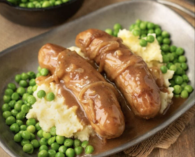 In this dish there are sausages, onion, garlic, sunflower oil, flour, vinegar, soy sauce, potatoes, peas, milk and butter. This dish is not very healthy because it is fried and there are some unhealthy ingredients for example the sausages, the butter or the sunflower oil.